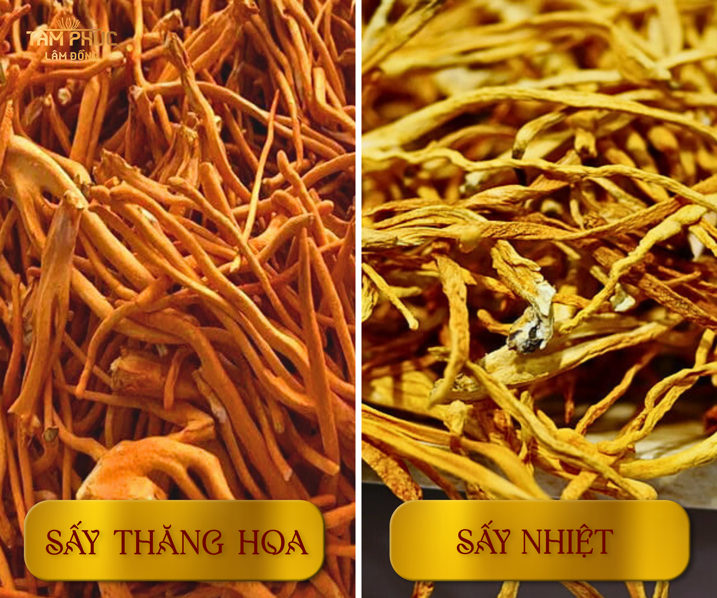 Dễ dàng nhận thấy sự khác biệt bằng mắt thường. Sợi nấm sau khi sấy thăng hoa giữ được màu sắc, hình dạng như sản phẩm tươi. Ngoài ra, sợi nấm sau khi sấy thăng hoa vẫn giữ được mùi thơm đặc trưng của ĐTHT.